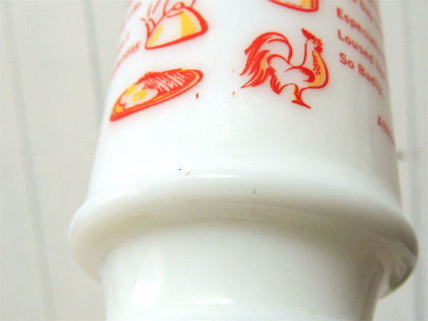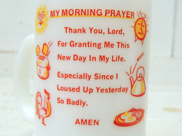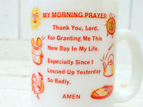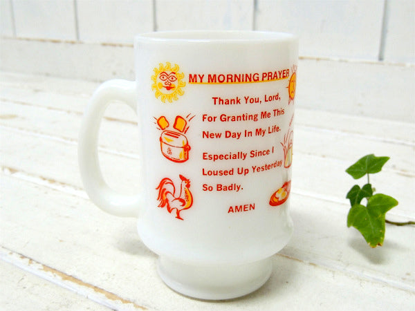 脚付きの白いミルクガラスの両面に、【MY MORNING PRAYER(朝のお祈り)】の言葉【Thank You, Lord, For Granting Me This New Day In My Life. Especially Since I Loused Up Yesterday So Badly. “Amen”】と、太陽&目覚まし時計&トースター&ケトル&ニワトリ&目玉焼きのカラフルなプリントが入っています。