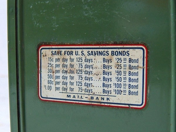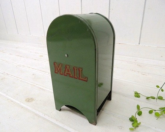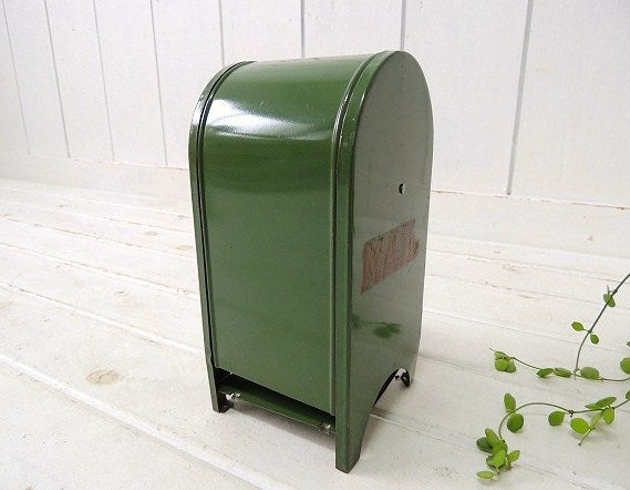 アメリカで見つけました・・アメリカの郵便ポストの形をした、オリーブグリーン色のメタル製・ヴィンテージ・コインバンク(貯金箱)です。