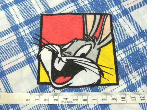 青×白色ベースの斜めチェック柄ベースに、ルーニーテューンズの人気キャラクター【バックスバニー】【トゥイーティー】【シルベスター】【タスマニアデビル】のパネル柄プリントです。