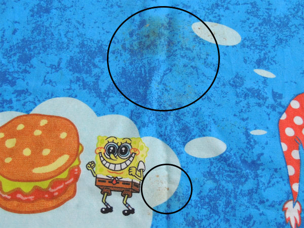 アメリカ西海岸・カリフォルニア州で見つけました・・・アメリカの人気テレビアニメ『スポンジボブ』のハンバーガー柄・USEDフラットシーツです。(ツインサイズ) スポンジボブがハンバーガーの夢を見ている、カラフル&ポップな総柄プリントです。 裾(約13cm)はオレンジ色の花柄です。 キャラクター生地として、お洋服や小物・バッグなどハンドメイド&リメイク素材などに・・♪ 経年による多少の使用感・2箇所程にヨゴレ部分が見られます。 日本国内にてお洗濯済みです。 画像(写真)でのご判断を宜しくお願い致します。 ■SIZE :約 W160cm×H234cm ■コンディション : ★★★☆☆ ■レターパックプラス¥510対応可(追跡サービスあり・補償なし) ※ご注文の際、お手数ですがメッセージ欄に『レターパックプラス希望』とご記入下さい。新たにお見積もりをメールにてお知らせさせていただきます。