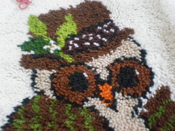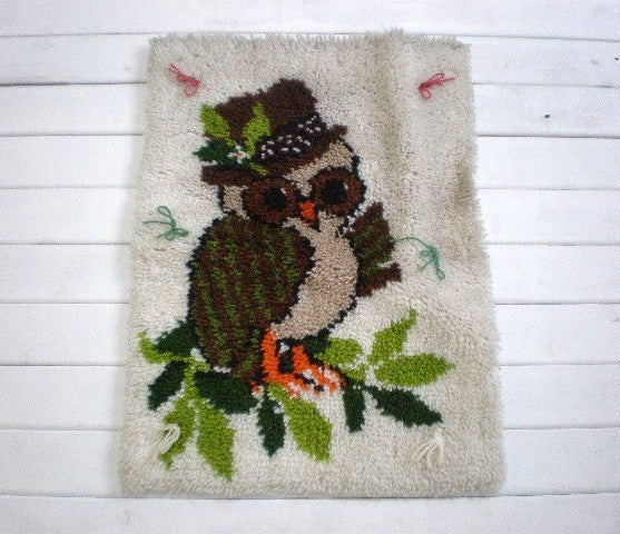 カリフォルニアでみつけました・・70年代・フクロウ柄のヴィンテージ・フックドラグ・タペストリーです。