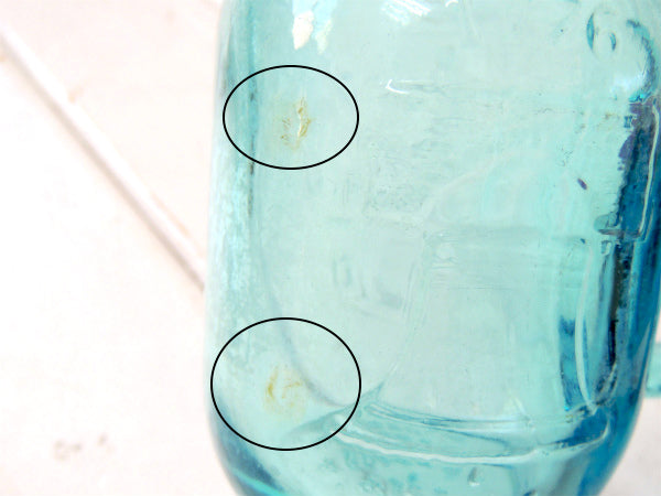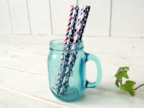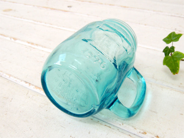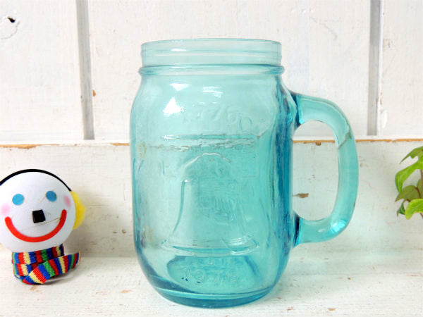ブルーグラスのメイソンジャーにハンドルが付いた記念グラスになります。