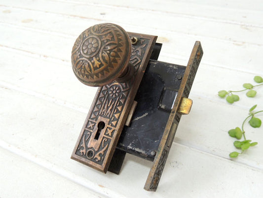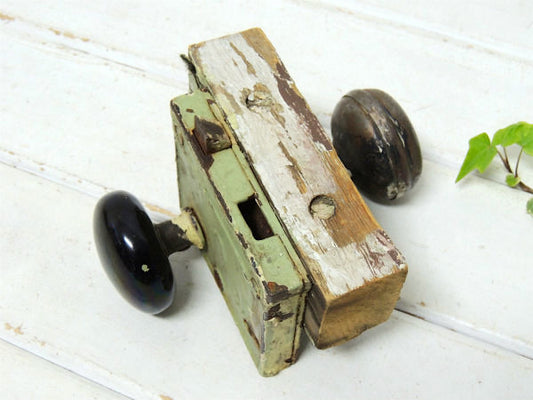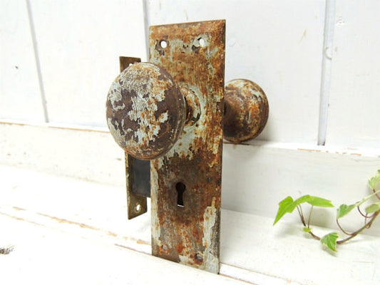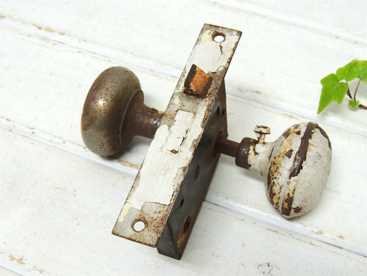 白いペンキの剥がれたシャビーなアンティーク・ドアノブ&ラッチバックセット USA