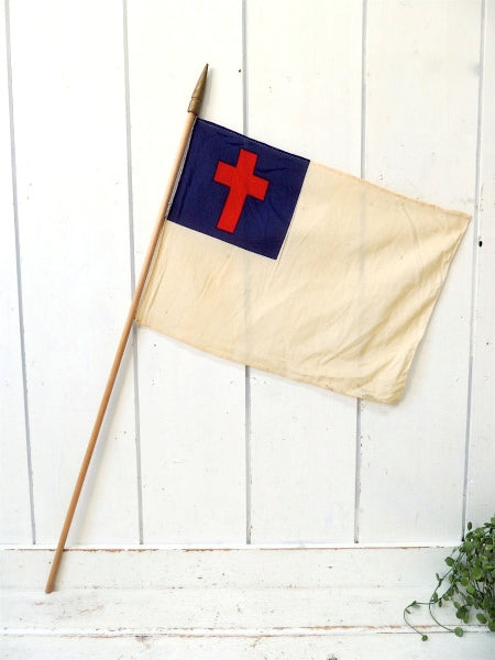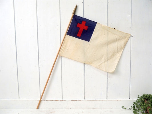 クリスチャンフラッグ 十字架・キリスト教・木製ポール付き・アンティーク・フラッグ・旗 USA・教会