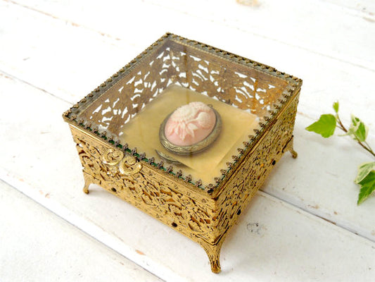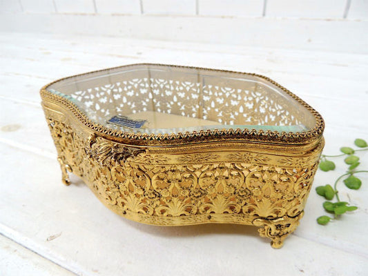 ベベルガラス・24金メッキ・脚付きアンティーク・ジュエリーボックス/宝石箱