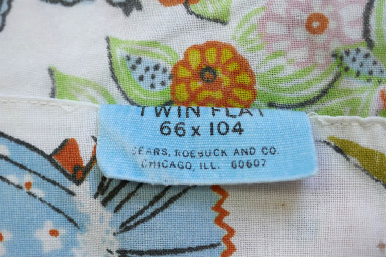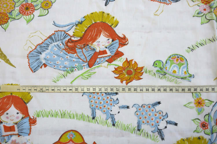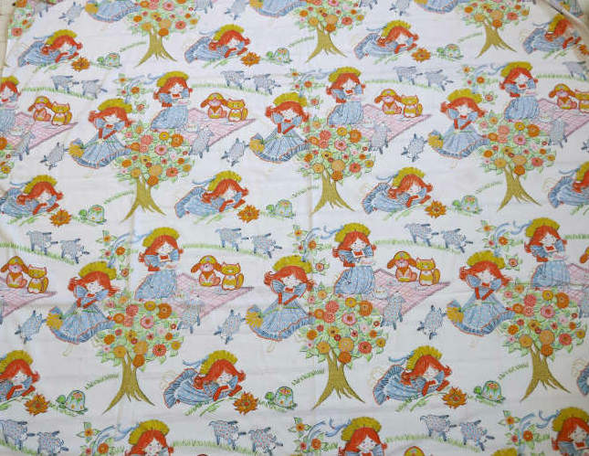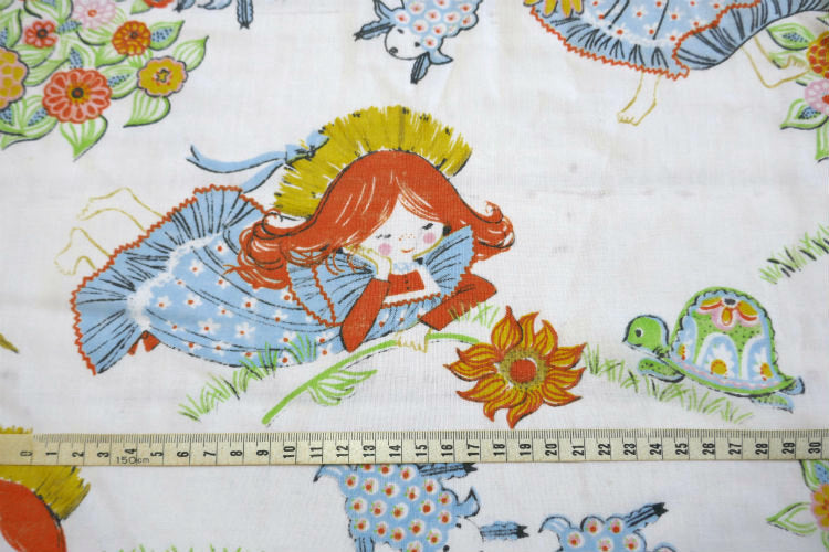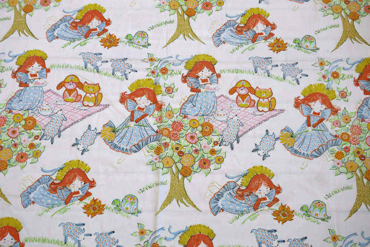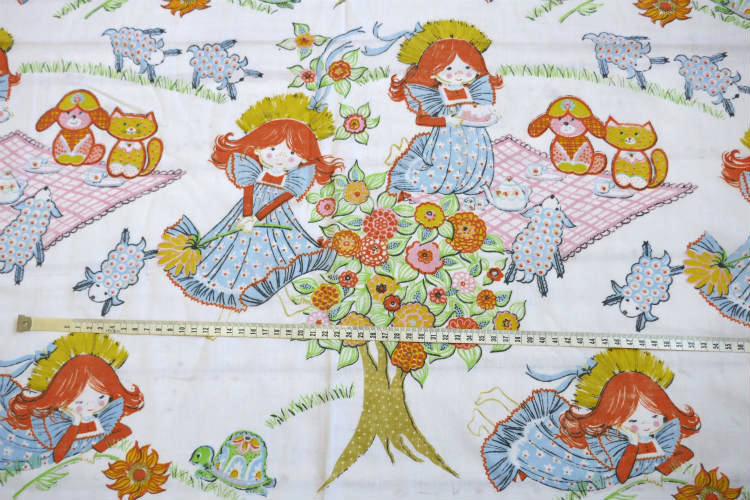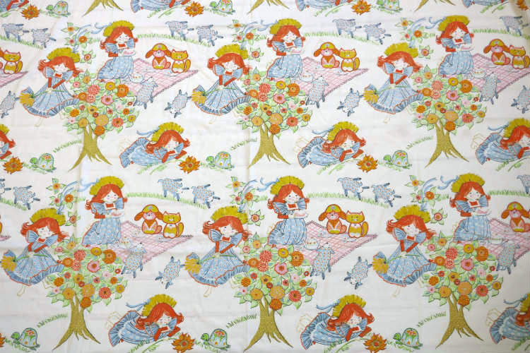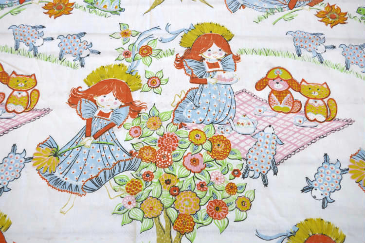 アメリカ西海岸・カリフォルニア州・ロサンゼルスで見つけました・・『女の子&動物たちピクニック柄』ヴィンテージ・USEDフラットシーツ(ハーフサイズ)です。