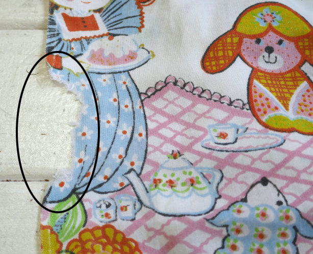 プリントの発色良く、生地もしっかりしておりますが、左端一部に約6㎝程のヤブレがございます。