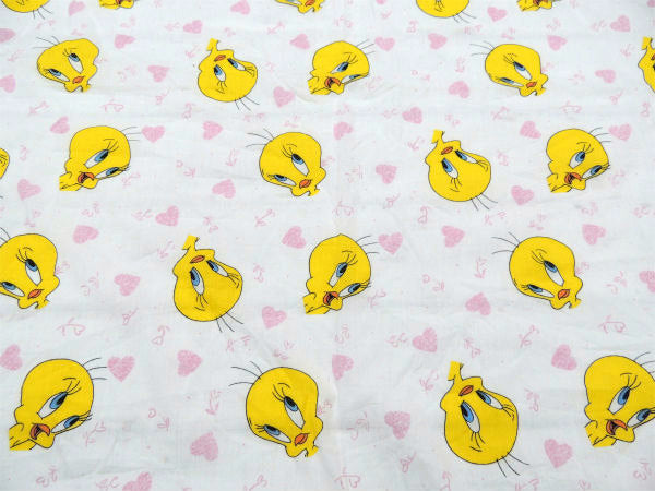 アメリカで見つけました・・ワーナーブラザーズを代表するアニメ『ルーニー・テューンズ』の人気キャラクター【トゥイーティー】のハート柄・ベビーサイズ・USEDフィットシーツです。