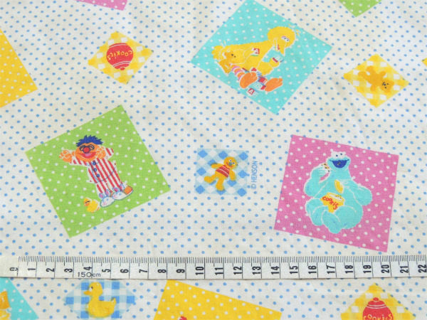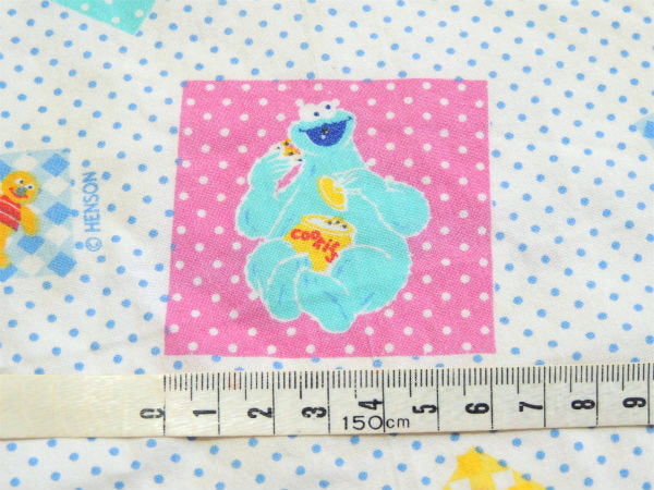 青色の小さなドット柄ベースに、クッキーモンスターやエルモ・アーニー・ビッグバードなどセサミの仲間たちの可愛いプリントです。