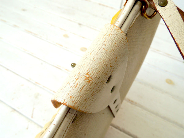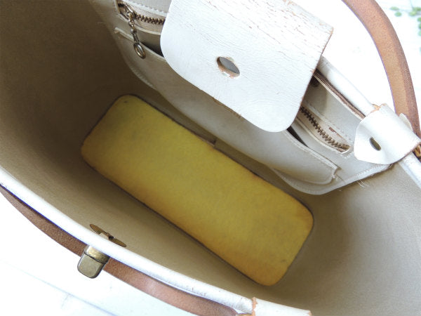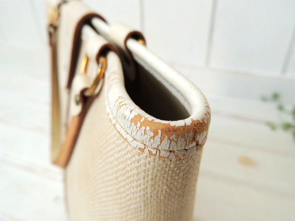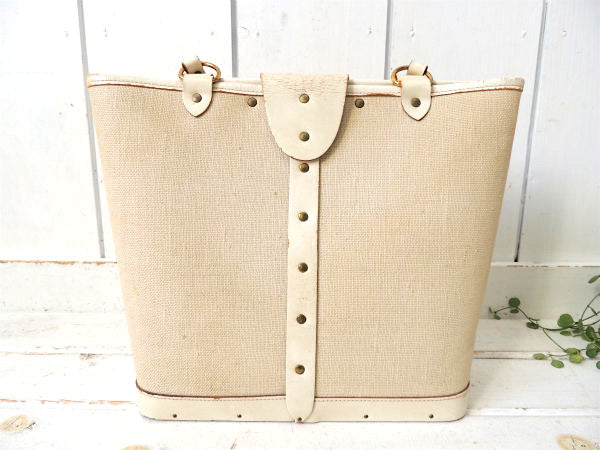ベース素材はキャンバス地で、持ち手&パイピング&留め部分はアイボリー色のレザー(本皮)製、ボトムは木製です。
