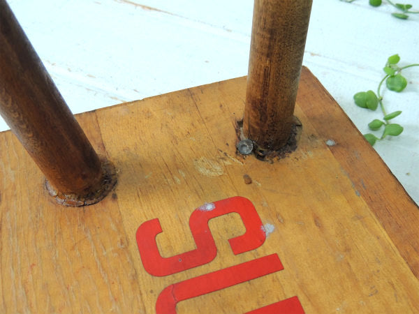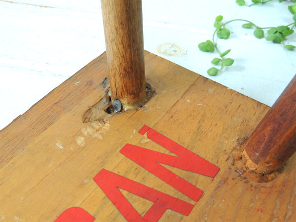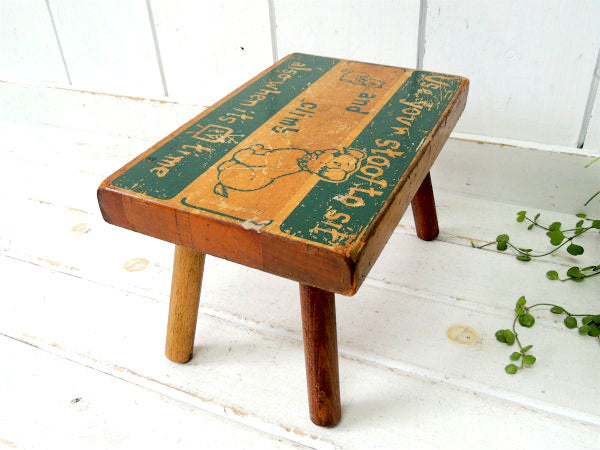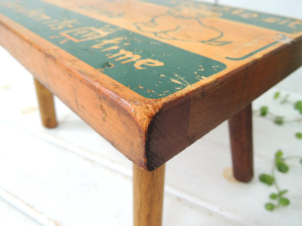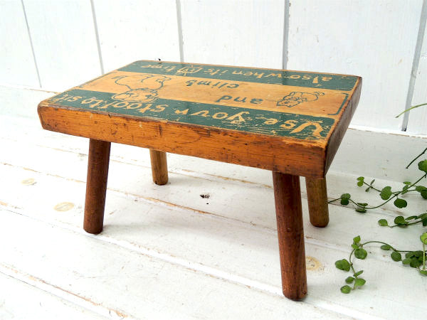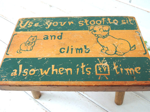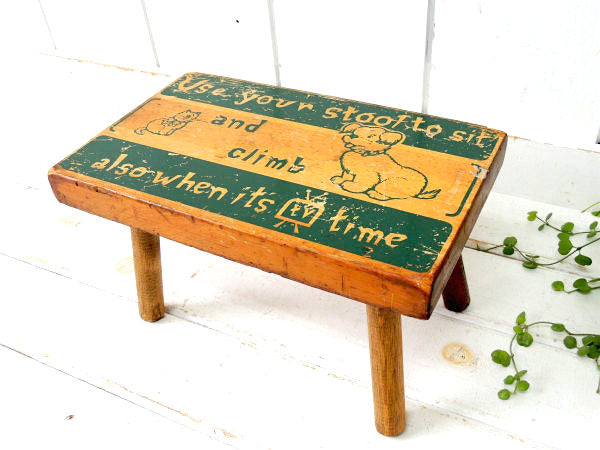 アメリカ西海岸、カリフォルニア サンフランシスコで見つけました・・犬&猫のイラスト&英文字入りの小さなアンティーク・木製スツール(踏み台/ローチェア)です。