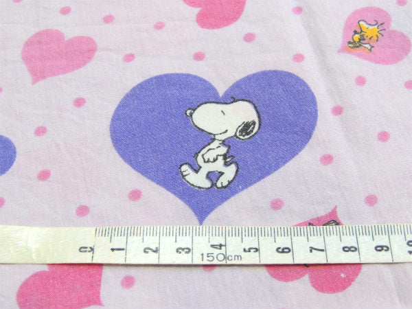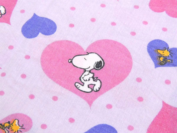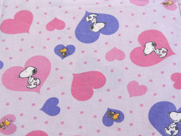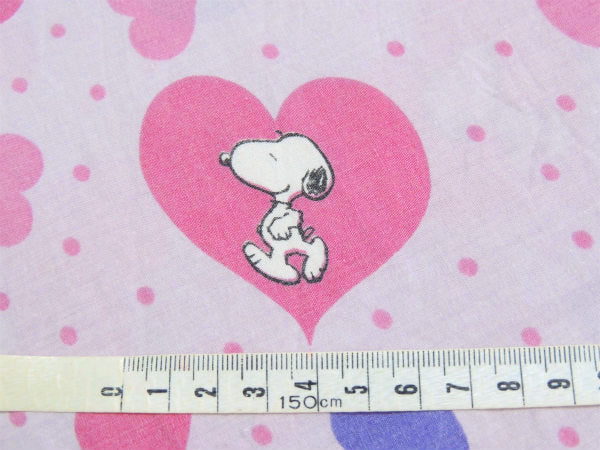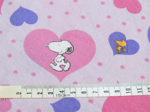 ピンク&パープル色のハート柄の中に、スヌーピーとウッドストックが入った、ラブリーな総柄プリントです。