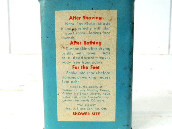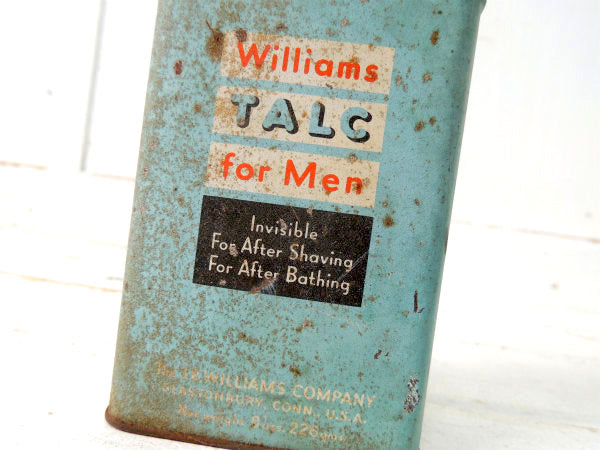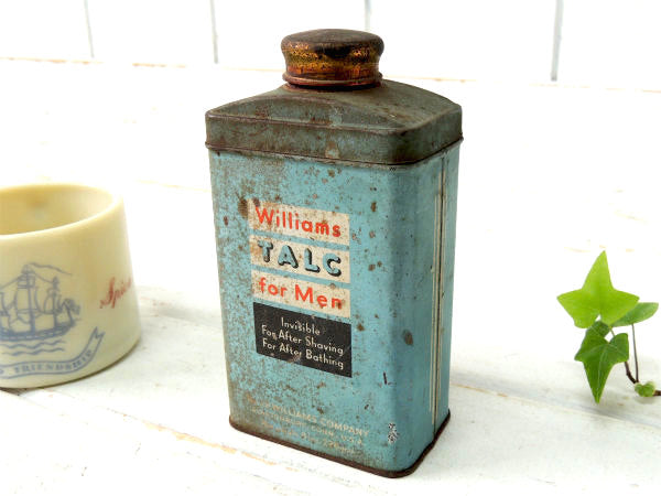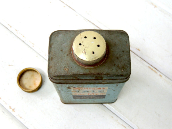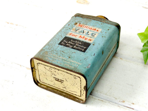 アメリカ西海岸・アラメダで見つけました・・”Williams TALC for Men”のブリキ製・アンティーク・シェービング&髭剃り用・パウダーケース(容器)です。当時のオリジナルのパウダー付いておりますが、古い為、使用不可でお願いします。