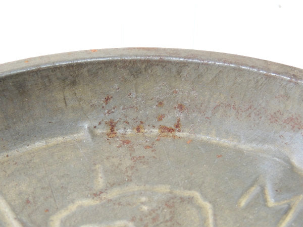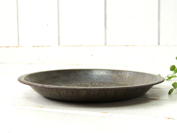 アメリカ西海岸・カリフォルニアでみつけました・・アメリカの国土の刻印『MONROE BOSTON STRAUSE』のティン製・アンティーク・パイ皿(パイプレート)です。 1940's頃 アメリカのパイ工場で実際に使われていたパイ皿です。 経年で多少のキズやサビがあり、時を経て少し変色し、使い込まれたシャビーな雰囲気たっぷりです。 アメリカ地図と【MONROE BOSTON STRAUSE】のエンボスが入っております。 キッチンやお部屋に立てかけてインテリアとしたり、トレイとして小物(アクセサリー・キーホルダー)のディスプレイとしても活躍してくれそうです♪ 底に穴があいているのは、底から蒸気を逃がしてパリっとしたパイを焼きあげるための工夫です。 経年による多少のヨゴレ・スリキズ・サビ等ございます。 玉子の紙パックは付いておりません。 画像(写真)での判断を宜しくお願いします。 ■size :約 W22.8cm×H2.0cm ■コンディション : ★★★★☆ ■レターパックプラス¥520対応可(追跡サービスあり・補償なし) ※ご注文の際、お手数ですがメッセージ欄に『レターパックプラス希望』とご記入下さい。新たにお見積もりをメールにてお知らせさせていただきます。