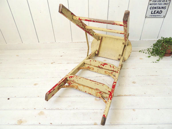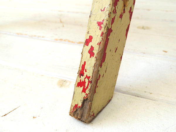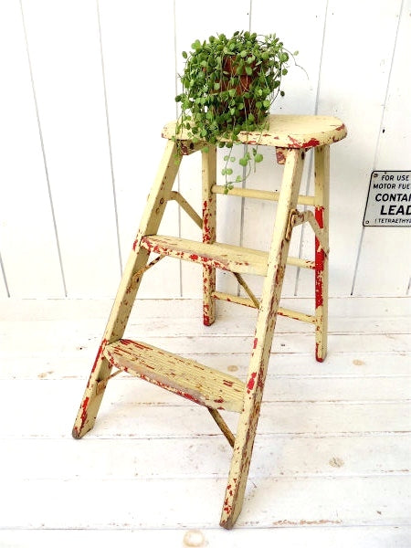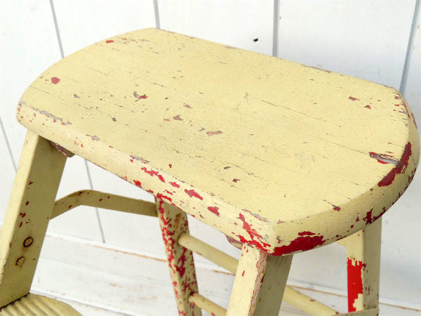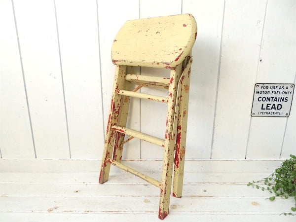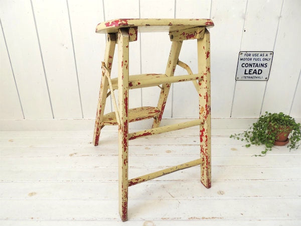 クリームイエロー・シャビー 木製・アンティーク・OLD・ステップラダー・脚立