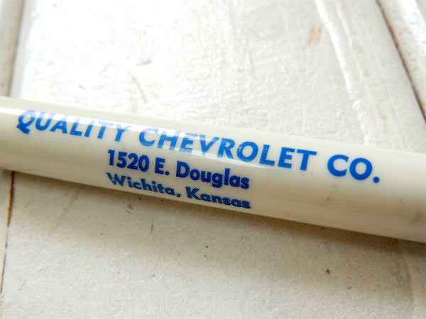 ホワイトベースにブルーカラーの英数字【CHEVROLETロゴ・ QUALITY CHEVROLET CO.・1520 E......Kansas】と入っております。