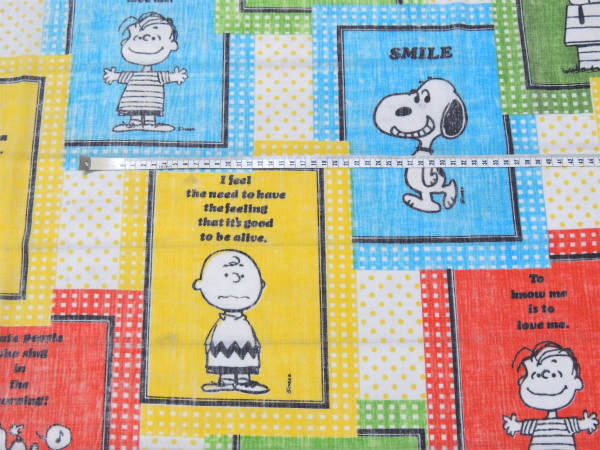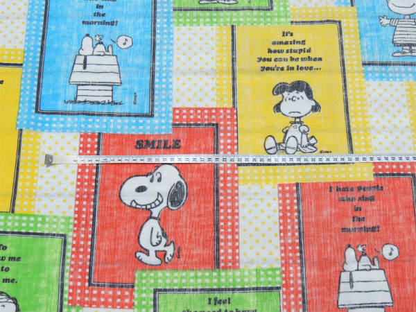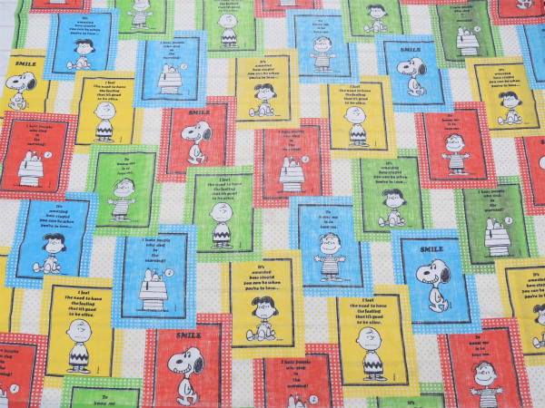 アメリカ西海岸・カリフォルニア州で見つけました・・『ピーナッツの仲間たち』のSMILEスヌーピー・パネル柄・70'sヴィンテージ・USEDフラットシーツです。