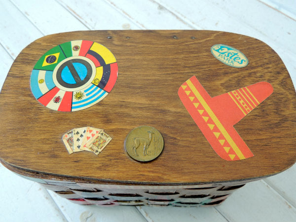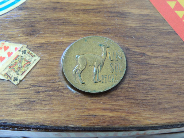 フタに、南米の国旗やソンブレロ(メキシカンハット)・トランプのデカール装飾、ラッキーペニーはペルー硬貨(ペソ)です。