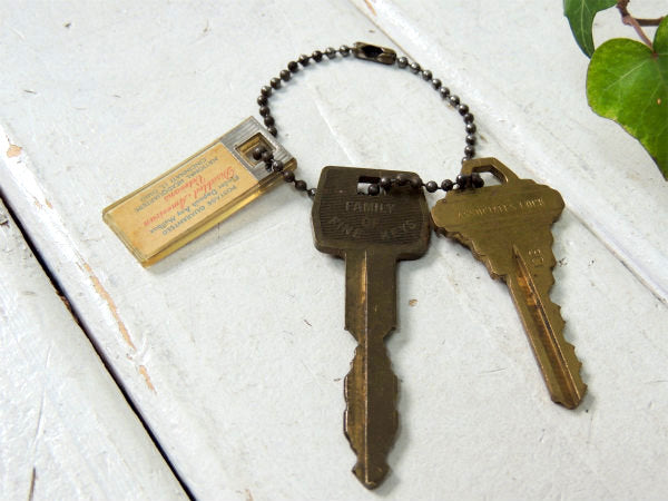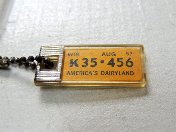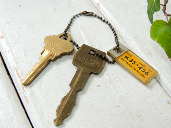 アメリカ南部・テキサス州・ダラス郊外で見つけてきました! 1957's ウィスコンシン州・ナンバープレート型 "AMERICA'S DAIRYLAND"・ヴィンテージ・キーホルダー+真鍮製 古鍵 2本付き( Ford FAMILY OF FINE KEY'S&) ボールチェーン付き