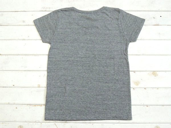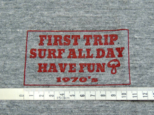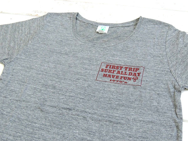 『First Trip(ファーストトリップ)』のショップオリジナル・レディースTシャツ(Mサイズ)です。 左胸に、海とサーフィンをこよなく愛する店主からのメッセージ【FIRST TRIP SURF ALL DAY HAVE FUN 1970's】のロゴプリント(W10.5㎝×H5.5㎝)が入っています。 ボディは、コットン&ポリエステル&レーヨンの3種類の糸を使用したヴィンテージの風合いある素材で、とても柔らかな肌触りで着心地良く、体に沿ったキレイなラインのシルエットです。 ジーンズと相性抜群です!! アメリカやヨーロッパを旅して!FIRST TRIPでは、半年に一度のペースでUSA各地へ商品の買い付け(バイイング)に出掛けています。州をまたぎ 好きな音楽を聞きながら風と日差しを感じ、ドライブする ロードトリップも大好き あらゆる場所を散策 匂いで嗅ぎつける・・笑 現地の文化を肌で感じながら、目で見て、手で触れて、買いつける。 ヴィンテージを大切にする、旅を楽しむスタイル 「ボチボチ イコウゼ オレタチハ」 アメリカヴィンテージアイテムは時代を経て海を越えてきた物語があり、あたたかみあるヴィンテージならではの味わいを楽しんでいただければと思い、いつもお店を運営させていただいています。 ■カラー:ヴィンテージヘザー(グレー)×ワインレッド ■素材:コットン38%/ポリエステル38%/レーヨン24% ■SIZE :Mサイズ 【着丈 約64cm】【肩幅 約38cm】【身幅 約45cm】【袖丈 約16cm】 ■コンディション:新品未使用(オリジナルタグ付き) ■レターパックライト¥360対応可(追跡サービスあり・補償なし) ※ご注文の際、お手数ですがメッセージ欄に『レターパックライト希望』とご記入下さい。新たにお見積もりをメールにてお知らせさせていただきます。