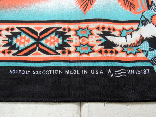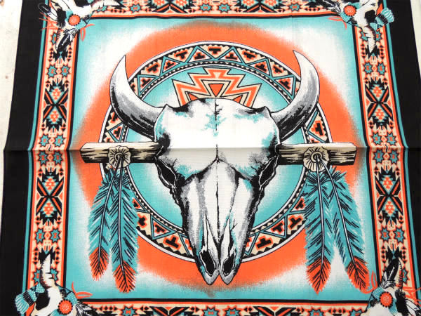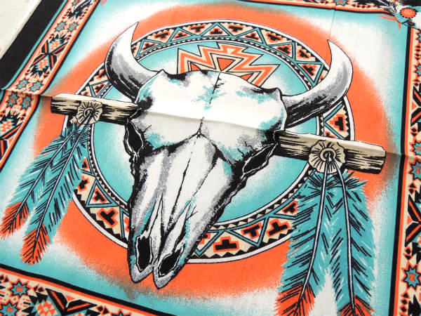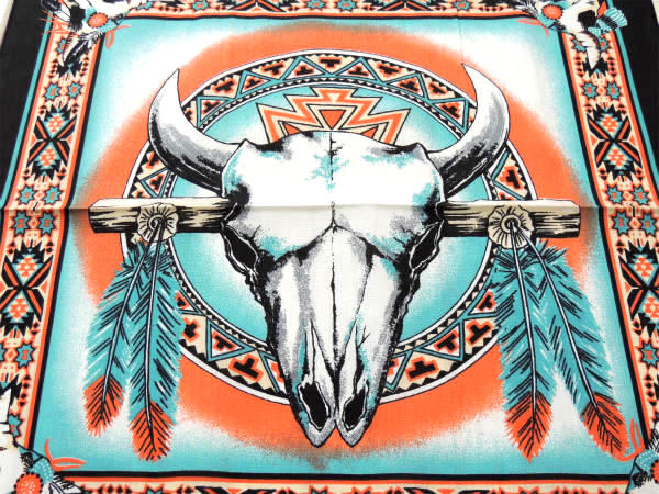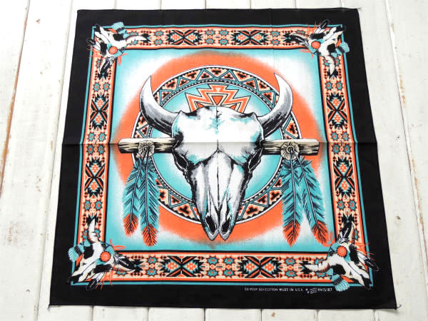アメリカ西海岸・カリフォルニア・ロサンゼルスで見つけました・・メイドインUSA『MADE IN USA』のネイティブ柄”バッファロースカル”ヴィンテージ・バンダナ(ハンカチ/スカーフ)です。