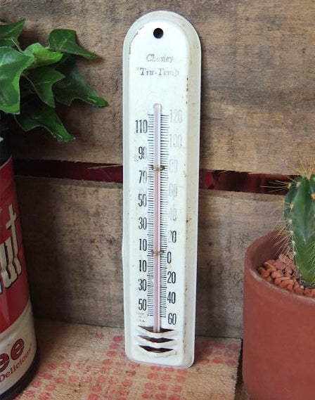 アメリカ西海岸・サンフランシスコで見つけました・・『Chaney Tru-Temp』のホーロー製・ヴィンテージ・温度計(サーモメーター)です。