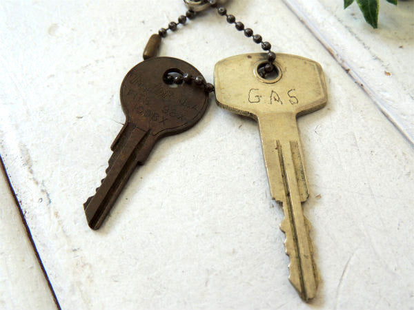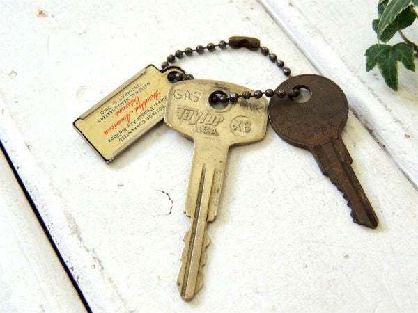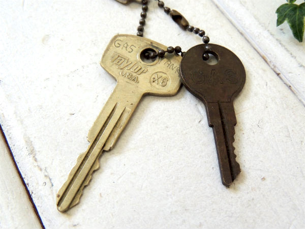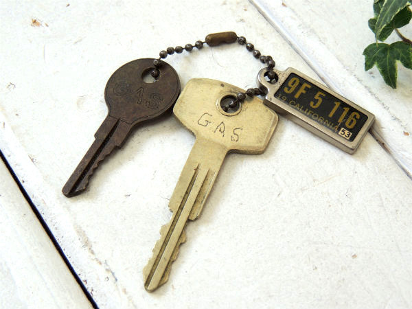 カリフォルニア・ナンバープレート型 "19 CALIFORNIA 53"・オールド・ヴィンテージ スチール製 キーホルダー+古鍵 2本付き(Taylor USA&GAS真鍮製) ボールチェーン付き