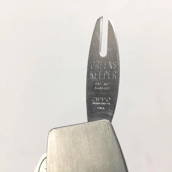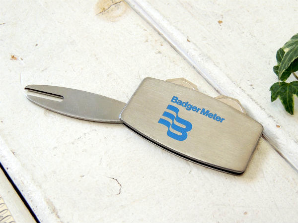サイドにゴルフマーカーが2個収納されており、グリーンフォークは引き出して使用いたします。 上部にブランドロゴ&【Badger Meter】、フォーク背面に【GREENS KEEPER /ZOPPO BRADFORD PA U.S.A.】と刻印がございます。