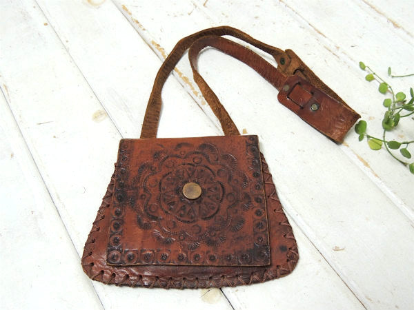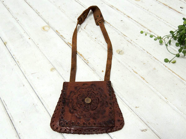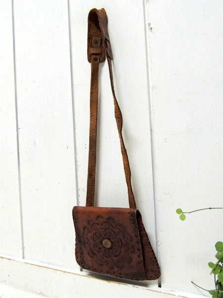 フラワー型押し・レザー製・ブラウン・ヴィンテージ・ショルダーバッグ・カバン・ショルダーポーチ USA