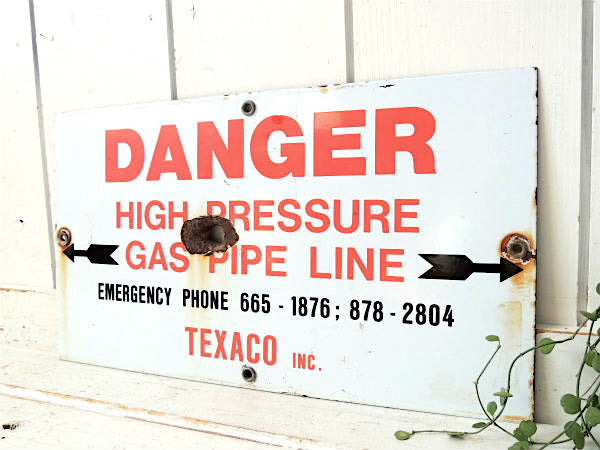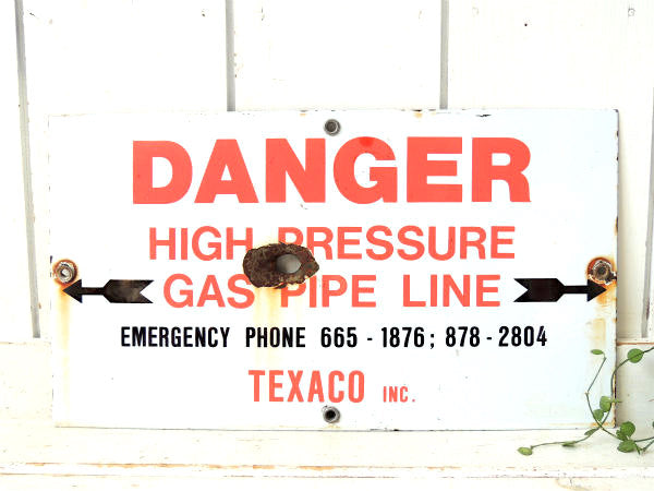 USAアメリカで実際に使われていた、【DANGER HIGH.....GAS....EMERGENCY PHONE 665 - 1876;878-2804 TEACO INC.】英数字・電話番号等あります。