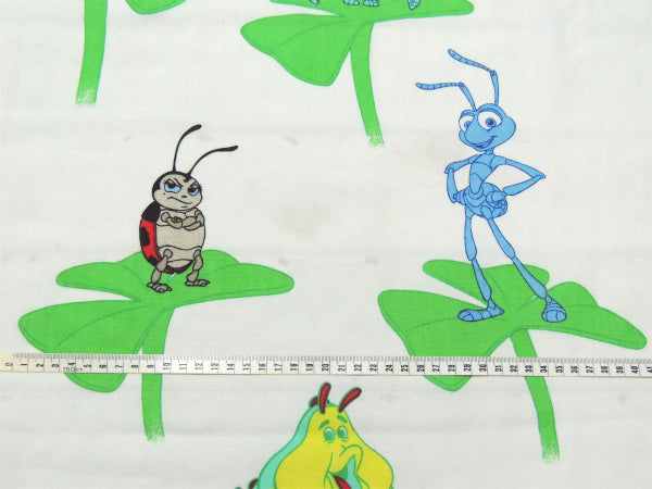 三つ葉のクローバーの上に乗った主人公アリのフリック&イモムシのハイムリック&てんとう虫のフランシス&ナナフシのスリム&双子ダンゴ虫のタック&ロールなどの、カラフルな総柄プリントです。