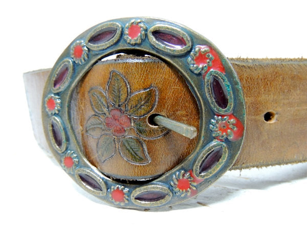 ベルト部分にお花の型押し模様が入っており、オーバル型の金属製バックルには赤×パープル色2種類の模様が施された、レトロなデザインです。