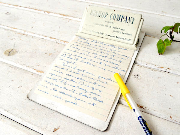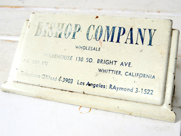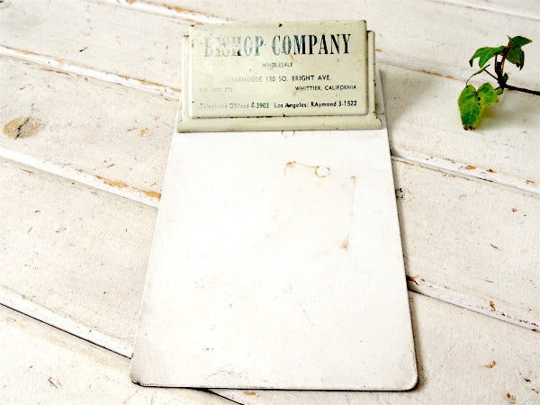 アメリカ西海岸・カリフォルニアで見つけました・・ロサンゼルス”BISHOP COMPANY・WHOLESALE”ホワイトカラー・アイアン製・アドバタイジング・ヴィンテージ・クリップボード(バインダー)です。