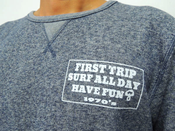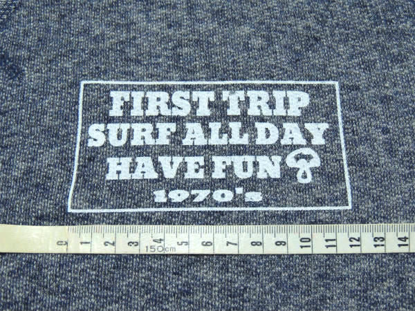 左胸にメッセージ【FIRST TRIP / SURF ALL DAY / HAVE FUN 1970's】のロゴプリント(W12㎝×H6㎝)が入っています。