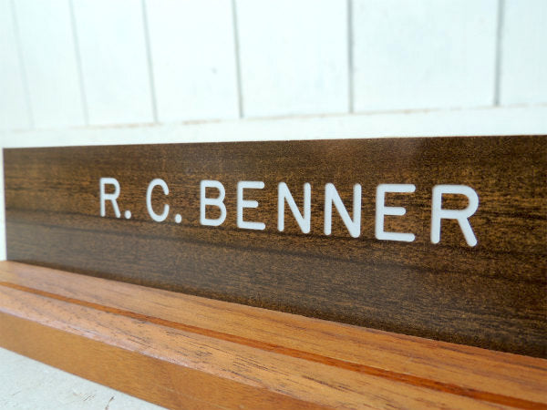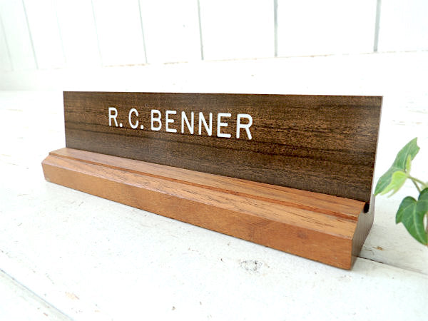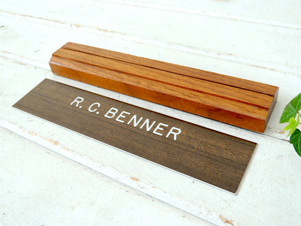 アメリカ西海岸・カリフォルニアで見つけました・・ウッド柄・ヴィンテージ・卓上”R.C. BENNER”ネームプレート・サイン(スタンド・看板・席札)です。