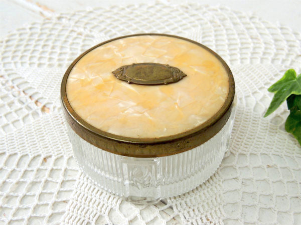 真鍮で囲われたメタル製のフタの上部には、真珠層(マザーオブパール)のようなキラキラとした小さなプレートがオレンジ色の樹脂の中に閉じ込められ、小さな真鍮のプレートがあしらわれたエレガントな雰囲気漂うお品です。