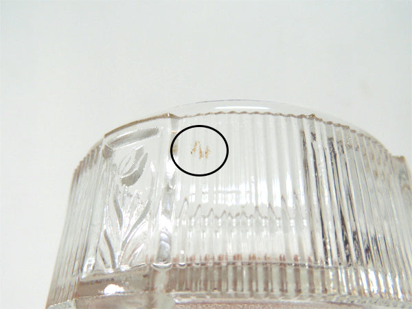 小さな脚の付いた重みのあるガラスケースの側面に、細やかなストライプのエンボスと4箇所にチューリップの模様が施された、アールデコ&アールヌーボー・デザインが素敵です。