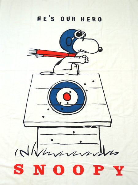 ホワイトベースに、犬小屋の上でゴーグルとスカーフを身に着けたフライングエースのスヌーピー&【HE'S OUR HERO/SNOOPY】の文字、4辺にライナスやシュローダー・ルーシーなど、ピーナッツの仲間のプリントです。