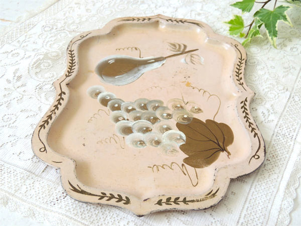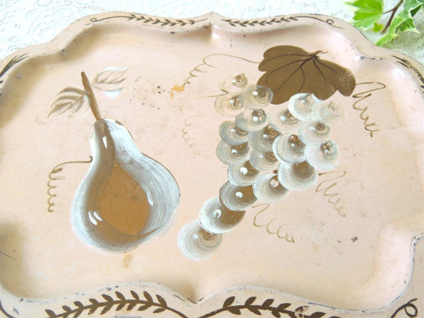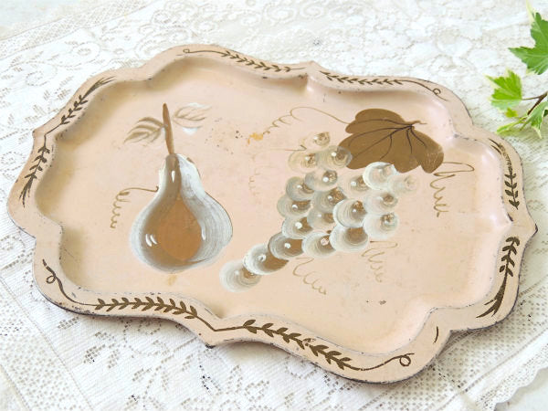 ハンドペイント トールペイント フルーツ柄 サーモンピンク色 ヴィンテージ トレイ アクセサリートレイ プレート USA