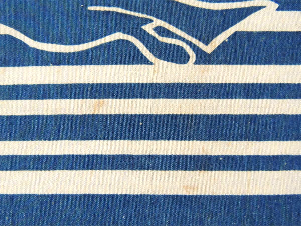 インディゴ×クリーム色のボーダー柄ファブリックに、羽を羽ばたかせて空を飛んでいるカモメのデザインです。