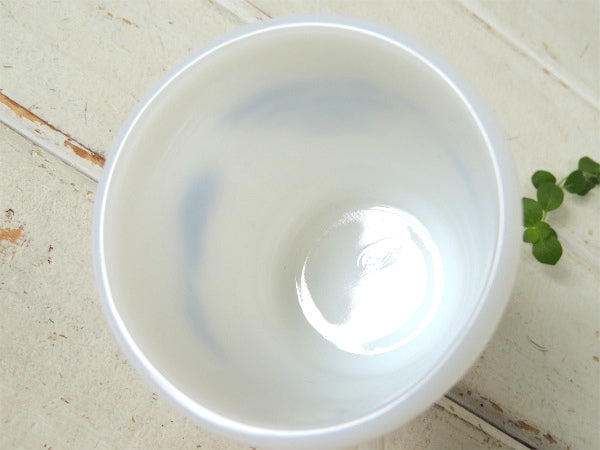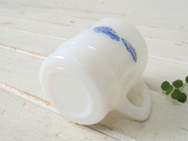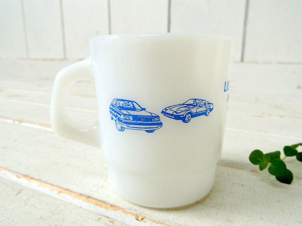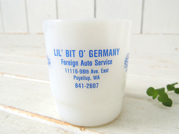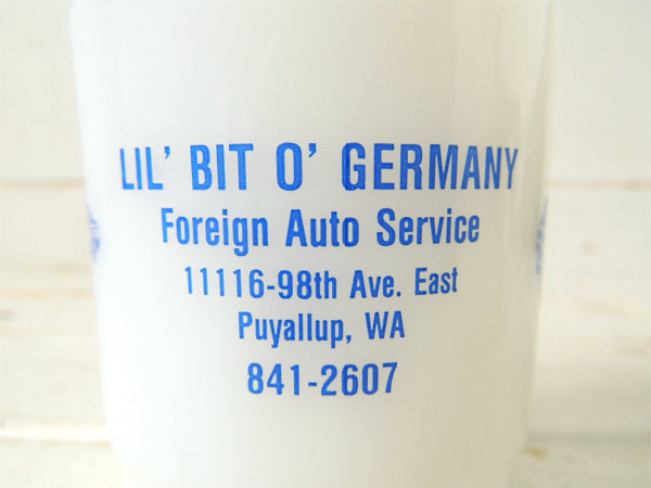 スタッキングタイプのホワイトベース・ミルクガラスの両面に、車2台の絵柄 、社名【LIL' BIT O' GERMANY Foreign Auto Service / 11116-98th Ave. East Puyallup, Wa /841-2607】の青色プリントが入っております。