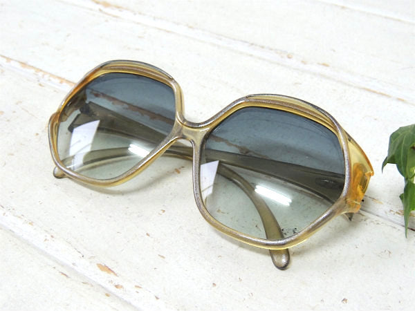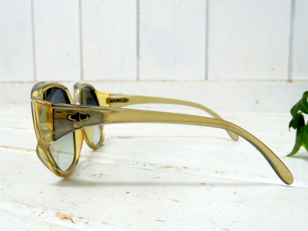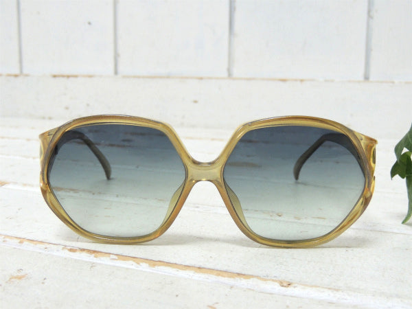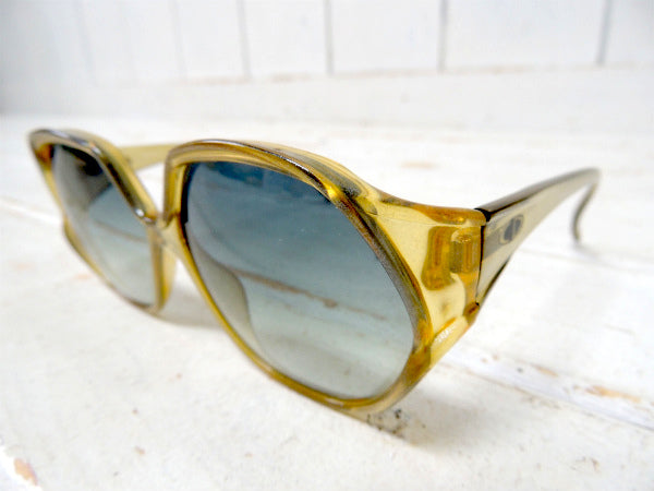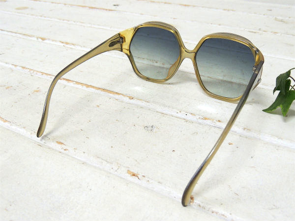 グリッター入りのイエロー×グレー色フレーム、ブルーがかったグラデーションの大きめのレンズが、70年代に大流行したヒッピースタイル特有の個性的なデザインです!