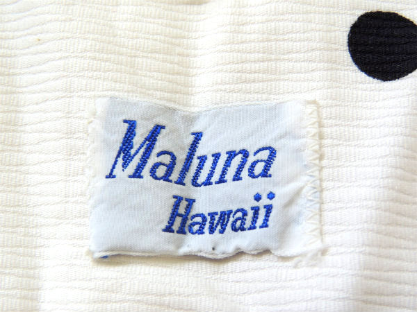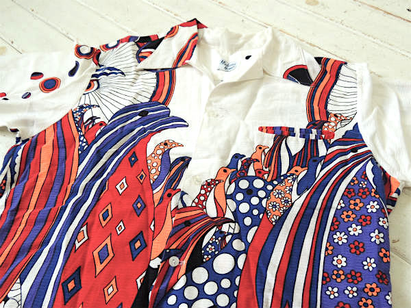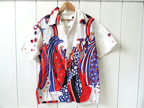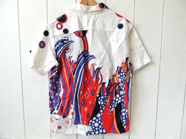 ハワイ・オアフ島で見つけました。 ”Maluna Hawaii"ヴィンテージ・アロハシャツ・個性あるデザイン(ピーコック・鳥柄・フラワー・サイケ柄) 1960〜1970年代頃〜   経年による多少のスリキズ・ホコリ等ございます。 シェラトン・木製・アンティークハンガーは付いておりません。 画像(写真)でのご判断を宜しくお願い致します。 大きなダメージはありませんが、USED:古着になりますので ご理解頂ける方のみご購入下さい。 ■Maluna Hawaii ■MADE IN   ■素材:表記なし (コットン製) ■カラー:ホワイト&カラフル ■SIZE :アロハシャツ【表記なし】 平置き実寸サイズ【着丈 約75.0cm】【肩幅 約48.0cm】【身幅 約59.0cm】【袖丈約24.5cm】 ■透明ボタン        ■コンディション:★★★★☆ ※アロハシャツ&ハワイアンシャツ (Aloha shirt) とは、1930年代頃〜パイナップルやフラを踊る女性などのトロピカルなモチーフや、金魚、鶴、虎などのオリエンタルなモチーフ(和柄と呼び)を華やかでカラフルな色彩で染め上げた、シルクやレーヨン、ポリエステル、綿などの生地を用いて作られる開襟シャツの事..。 ■レターパックプラス¥510対応可(追跡サービスあり・補償なし) ※ご注文の際、お手数ですがメッセージ欄に『レターパックプラス希望』とご記入下さい。新たにお見積もりをメールにてお知らせさせていただきます。