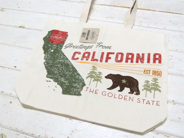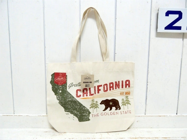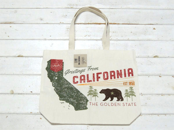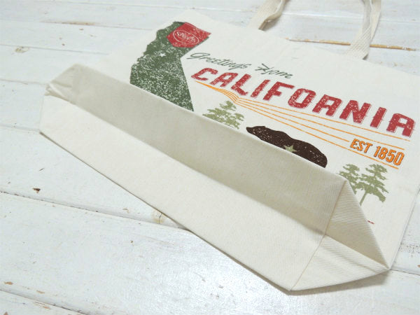 キャンバス地に、カリフォルニア州やグリズリーのイラスト&【Greeting From CALIFORNIA est 1850 / THE GOLDEN STATE】の英文字が入った両面プリントです。