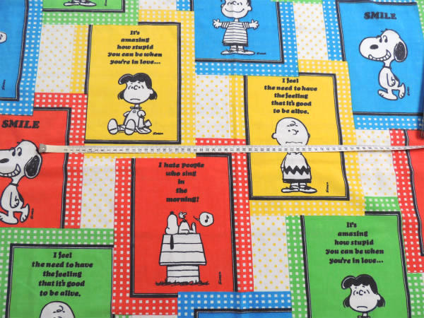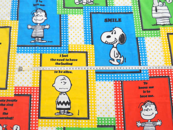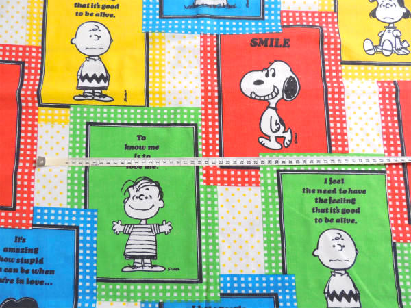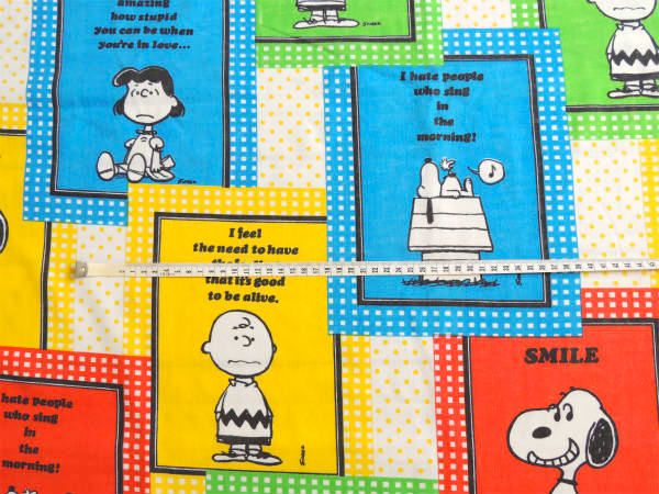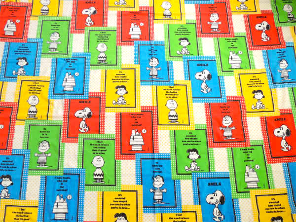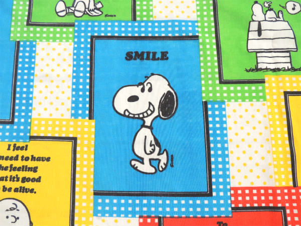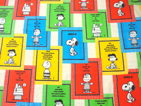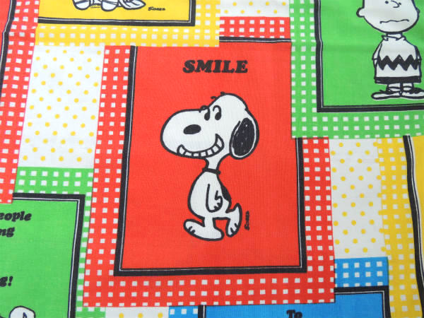 アメリカ西海岸・カリフォルニア州で見つけました・・『ピーナッツの仲間たち』のSMILEスヌーピー・パネル柄・ヴィンテージ・USEDフラットシーツ・1/4です。