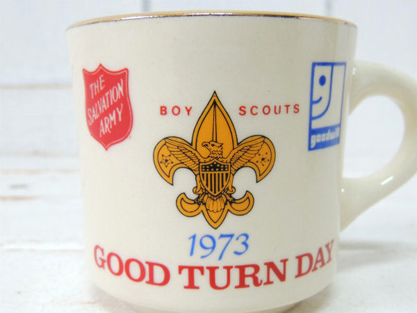 サルベーションアーミー(The Salvation Army)&グッドウィル(goodwill)の慈善活動を行う非営利団体のロゴが入っており、ボーイスカウトの活動日“GOOD TURN DAY”の記念マグと思われます。