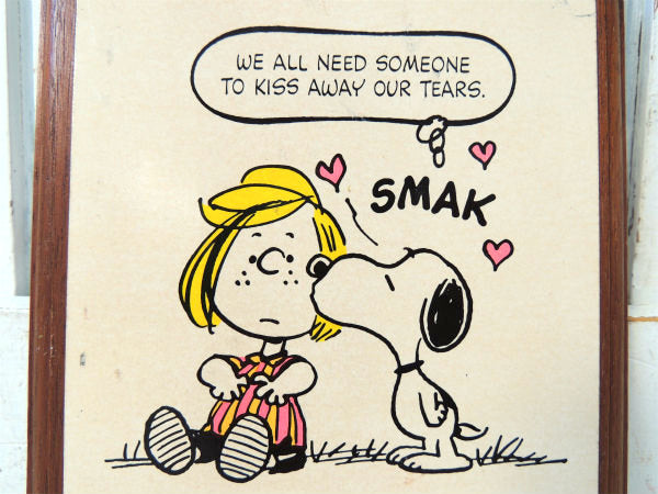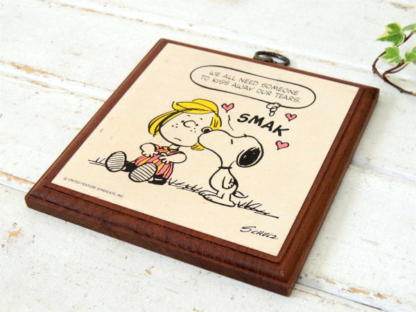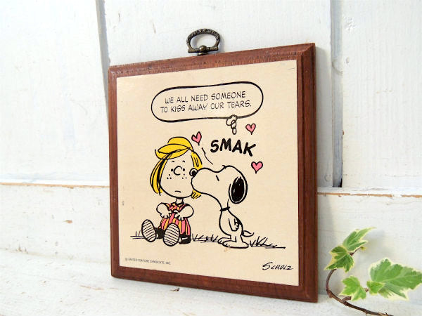 吹き出しのメッセージ『WE ALL NEED SOMEONE TO KISS AWAY OUR TEARS.(涙を拭うには、みんな誰かが必要です)』&スヌーピーがペパーミントパティのホッペにチュッ(SMAK)としている、ラブリーなデザインです。