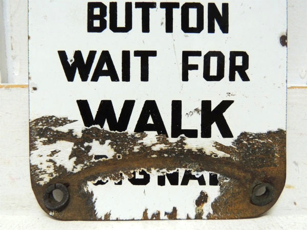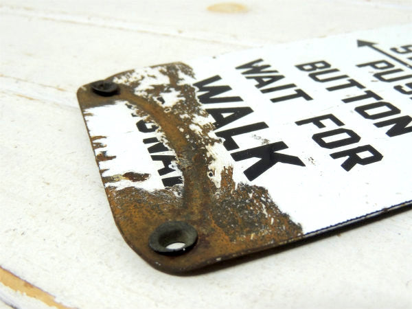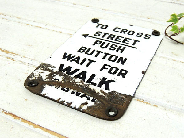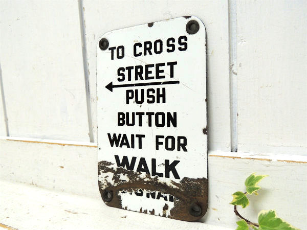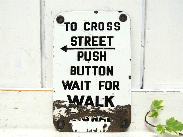 アメリカ合衆国、ニューメキシコ州で見つけました・・『TO CROSS STREET ← PUSH BUTTON WAIT FOR WALK ....』のホーロー製・ヴィンテージ・道路標識・サイン(看板)です。
