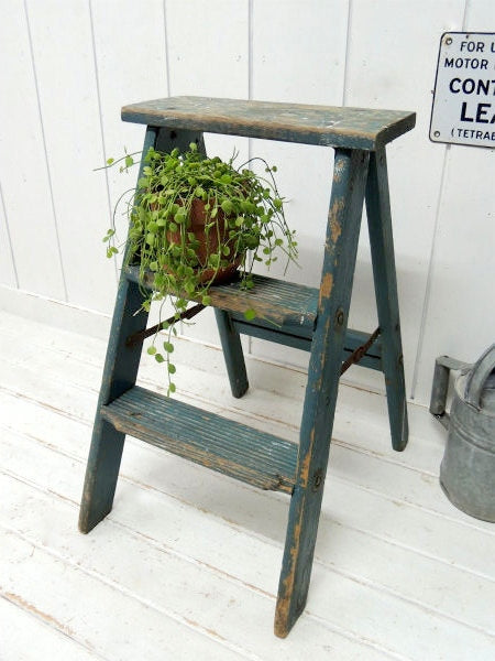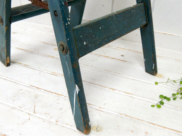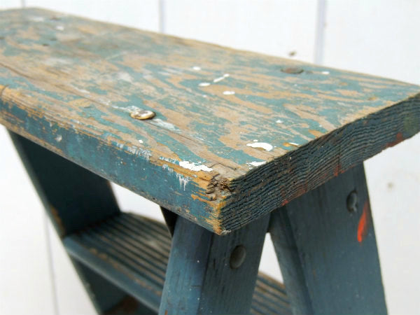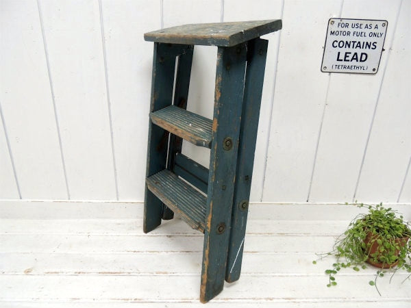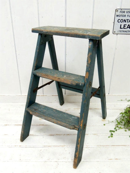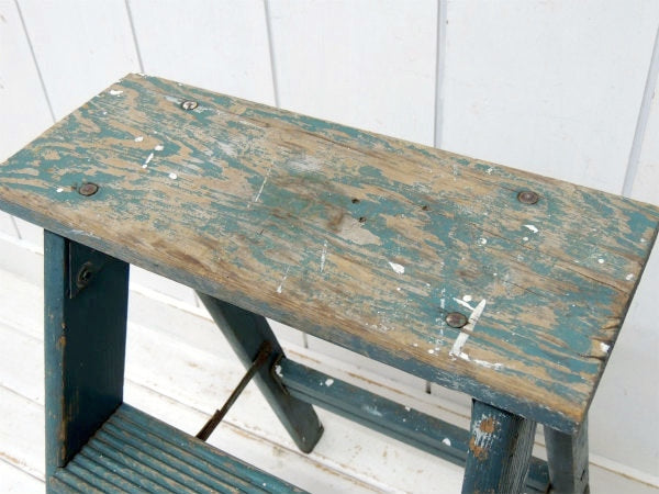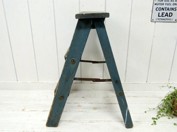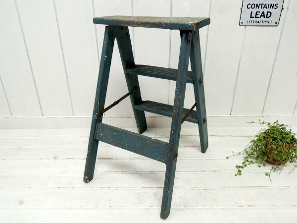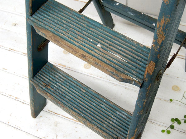 アメリカ西海岸・サンフランシスコの田舎町で見つけました・・ピーコックグリーン(青緑色)の木製・アンティーク・ステップラダー(脚立・踏み台)です。