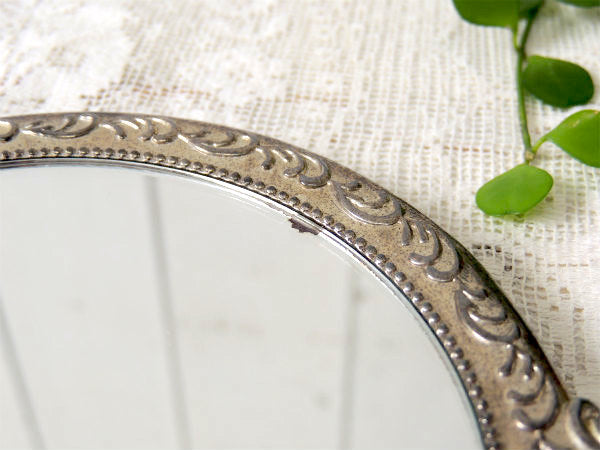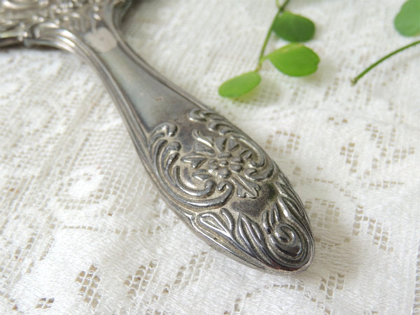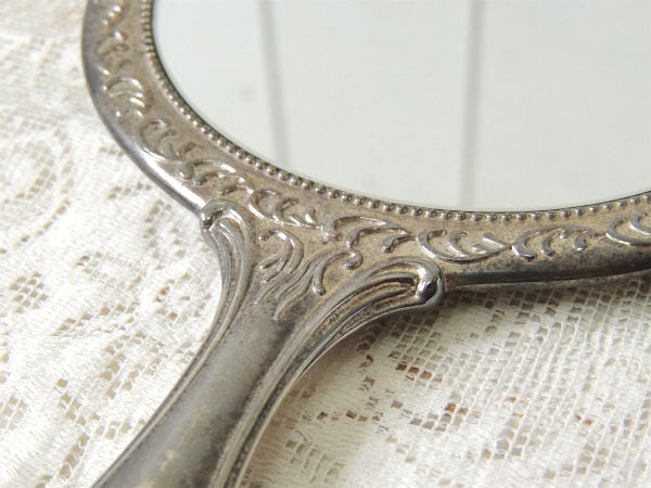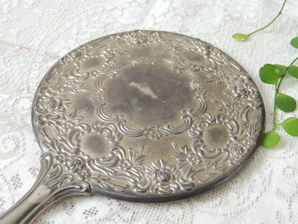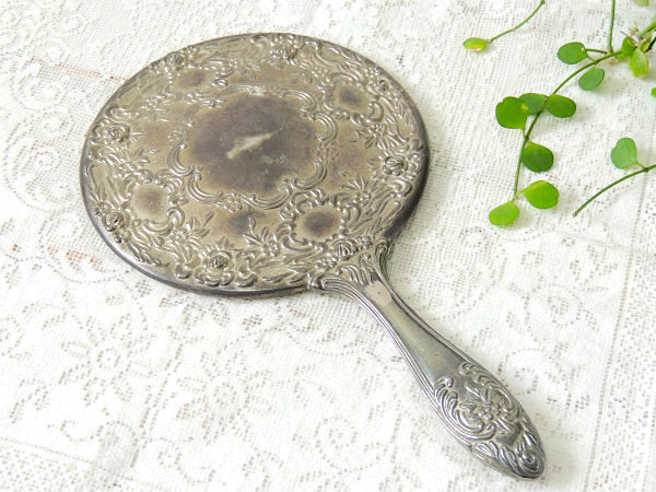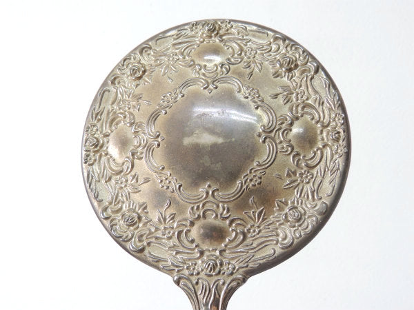ヴィクトリアン フラワー&リーフ柄モチーフ シルバープレート アンティーク ハンドミラー 手鏡 USA